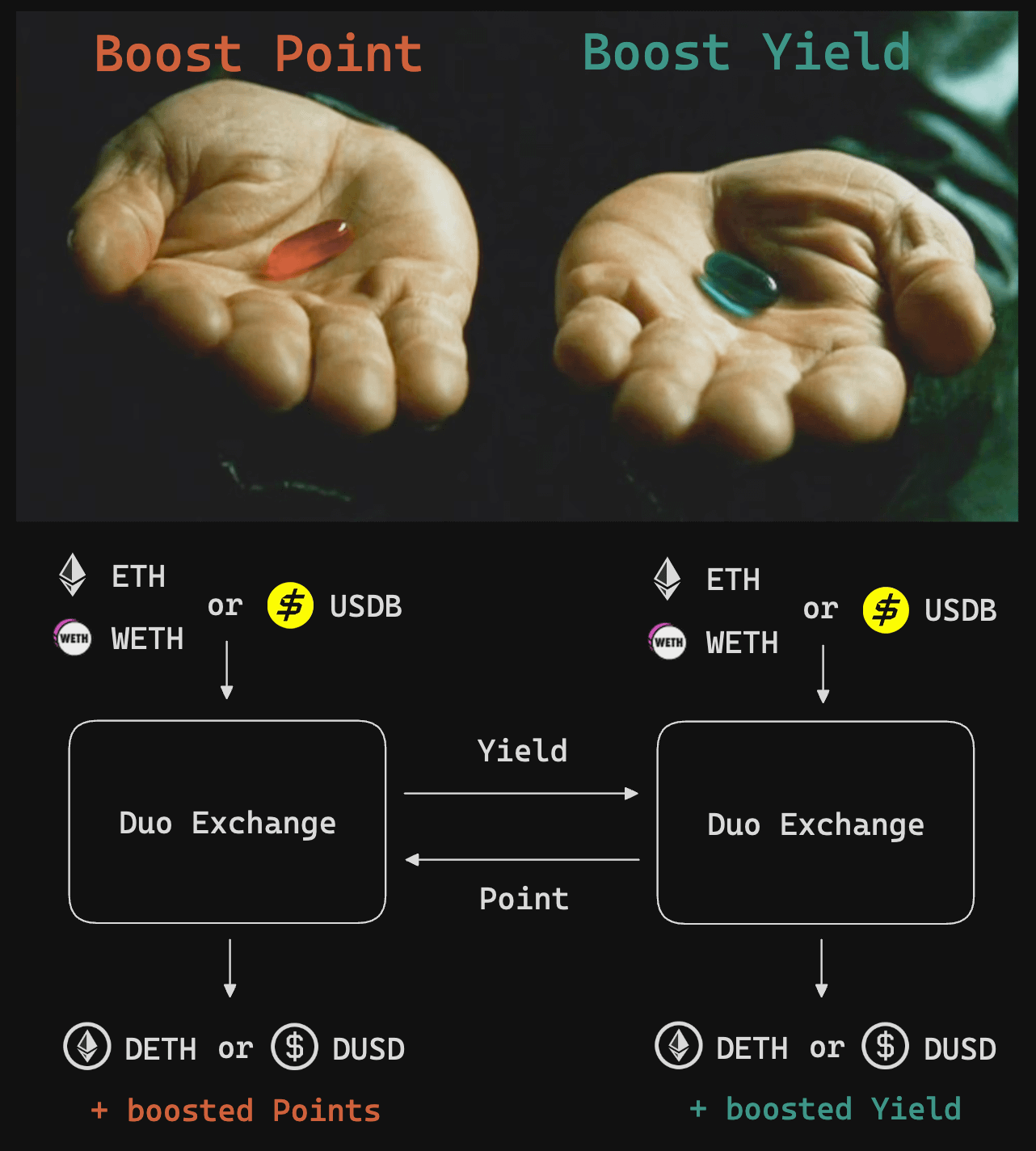 The vault allows two ways of liquidity provision, denoting LP1 and LP2. LP1 provides liquidity to get boosted points, but forgo the yield. LP2 provides liquidity to get boosted yield, but forgo the points.