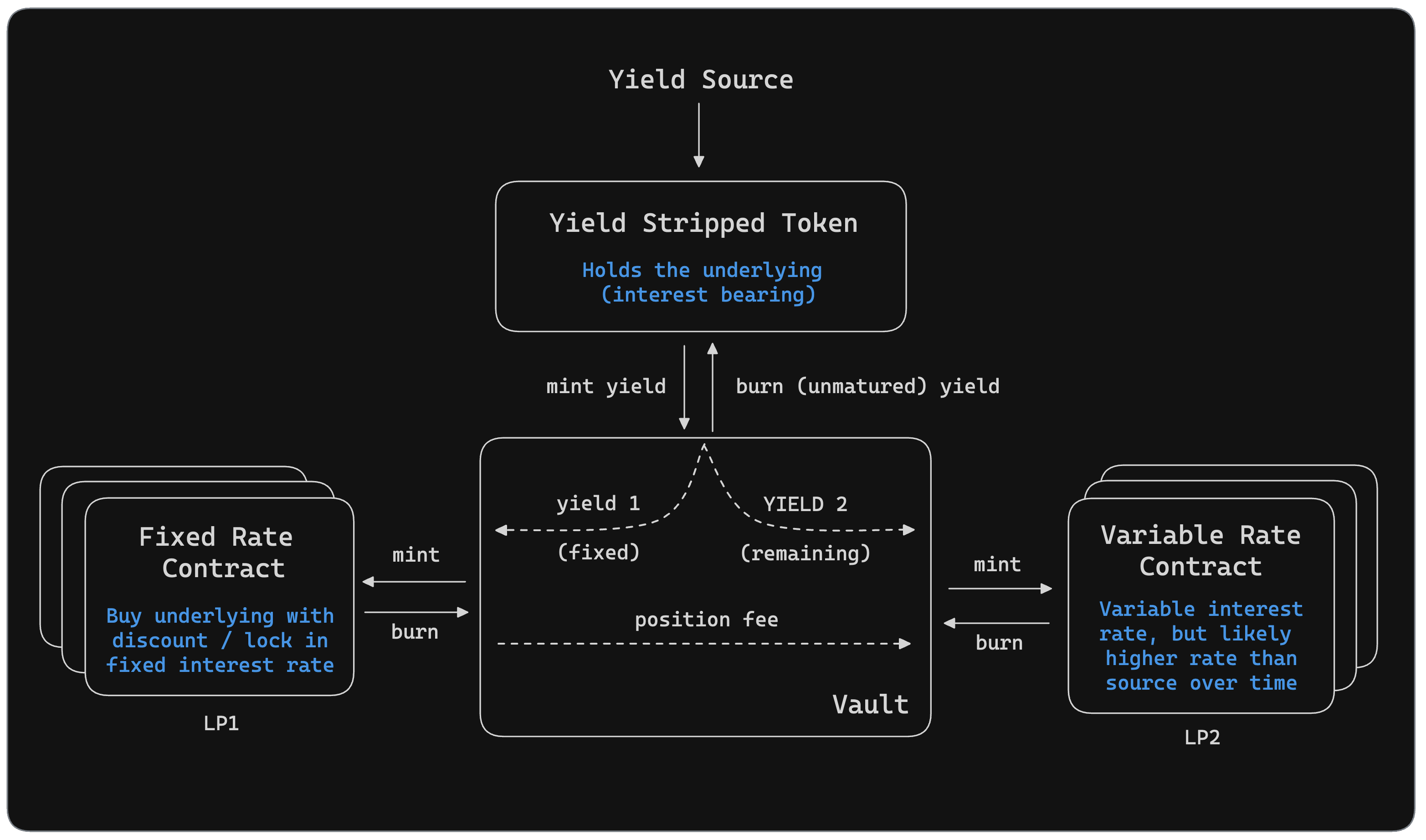 Variable-Fixed Yield Swap allows LPs to access (1) fixed rate yield until maturity and (2) variable but potentially higher yield compared to the yield source. A single `Vault` contract houses both liquidity flows.